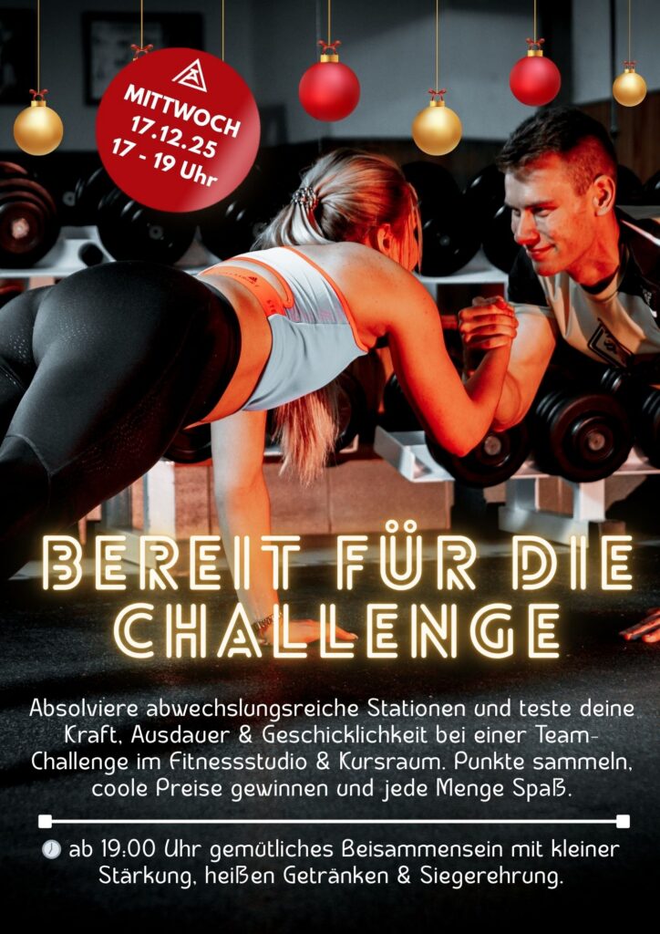 Am Mittwoch, 17.12.2015 von 17 — 19 Uhr haben wir wieder eine besondere Challenge für alle Delta Mitglieder geplant. Im Fitnessstudio und Kursraum werden verschiedene Stationen aufgebaut die ihr als Team meistern könnt. Egal ob Anfänger oder Fortgeschritten jeder kann mitmachen. Sammelt Punkte und gewinnt tolle Preise — Das Delta Team freut sich auf einen lustigen Abend mit euch. 😊🏋️💪